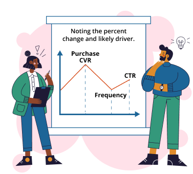 When week-over-week ROAS shifts, check Frequency (exposure), CTR (engagement), and Purchase CVR (conversion). CTR↑ with steady Frequency suggests creative or audience improvement; Frequency↑ with CTR↓ points to fatigue; CVR↓ with CTR stable suggests checkout or offer friction. Note the percent change and likely driver.