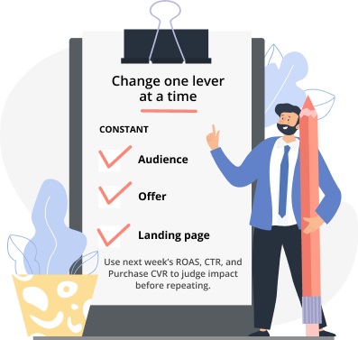 Change one lever at a time. Keep audience, offer, and landing page constant; refresh only creative or messaging if engagement is the issue, or address checkout/offer if CVR fell. Use next week’s ROAS, CTR, and Purchase CVR to judge impact before repeating.