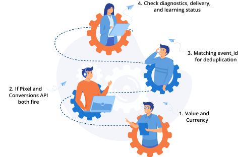 Open Events Manager and confirm the Purchase event includes value and currency. If Pixel and Conversions API both fire, add matching event_id for deduplication. Check diagnostics, delivery, and learning status before judging performance.